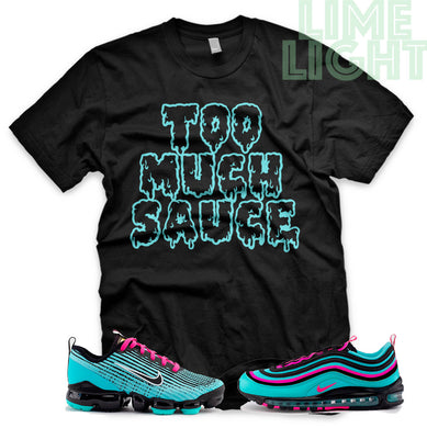 Hyper Turquoise/ Pink Blast "Too Much Sauce" VaporMax Flyknit 3 Black T-Shirt