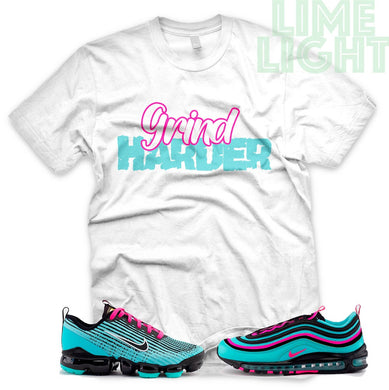 Hyper Turquoise/ Pink Blast "Grind Harder" VaporMax Flyknit 3 White T-Shirt