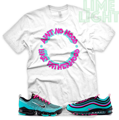 Hyper Turquoise/ Pink Blast "Ain't No Hood Like Fatherhood" VaporMax Flyknit 3 White T-Shirt