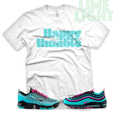Hyper Turquoise/ Pink Blast "Happy and Humble" VaporMax Flyknit 3 White T-Shirt