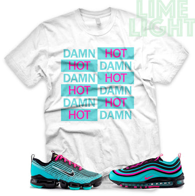 Hyper Turquoise/ Pink Blast "Hot Damn" VaporMax Flyknit 3 White T-Shirt