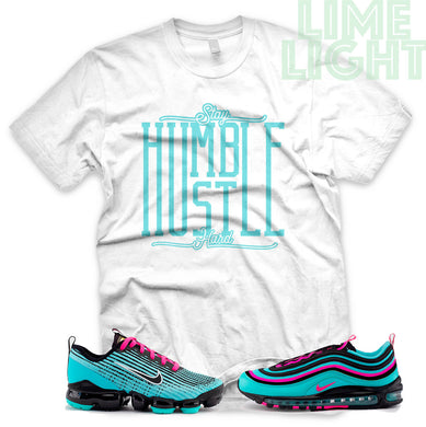 Hyper Turquoise/ Pink Blast "Stay Humble Hustle Hard" VaporMax Flyknit 3 White T-Shirt