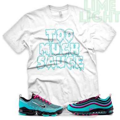 Hyper Turquoise/ Pink Blast "Too Much Sauce" VaporMax Flyknit 3 White T-Shirt