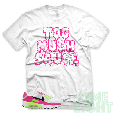 Pink Blast/ Ghost Green "Too Much Sauce" Air Max 90 White T-Shirt