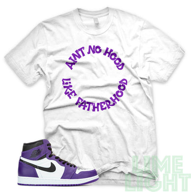 Court Purple "Ain't No Hood Like Fatherhood" Air Jordan 1 Retro White Sneaker T-Shirt