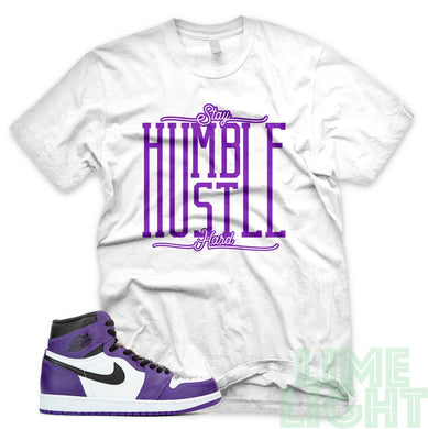 Court Purple "Stay Humble Hustle Hard" Air Jordan 1 Retro White Sneaker T-Shirt